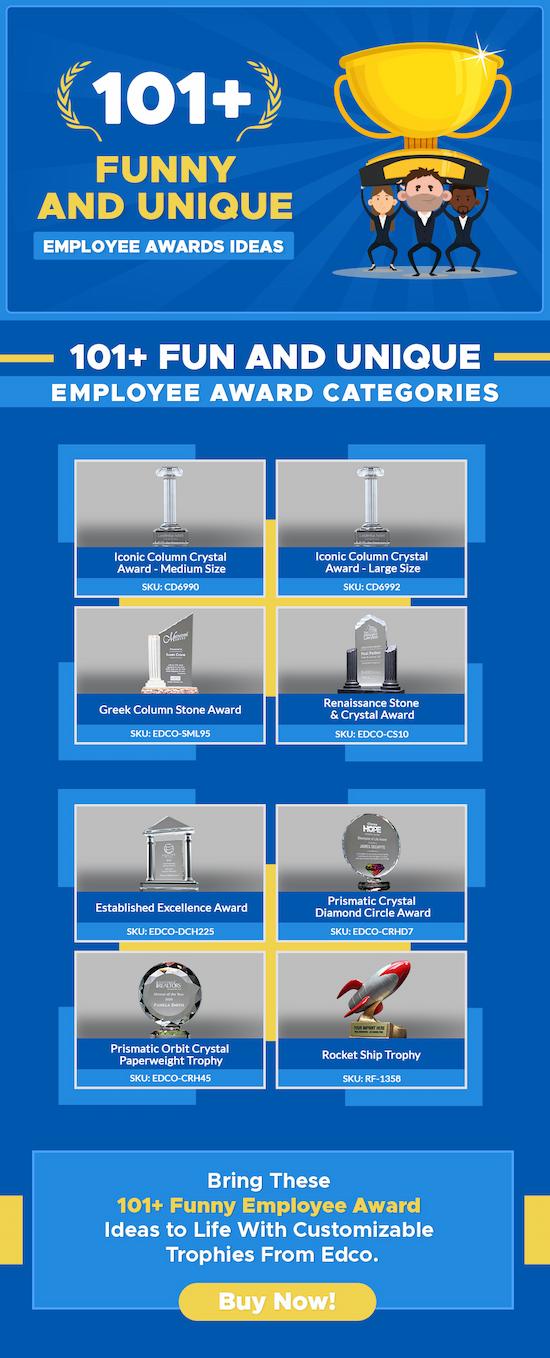- Start by considering the employee’s role, personality, and contribution. EDCO categorizes awards by themes such as creativity, safety, novelty, and leadership, making it easy to find a good match. You can also personalize each trophy with names, dates, and messages to highlight why the recipient stands out.