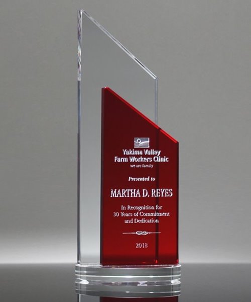 This stunning design called the Red Success Award is sure to catch the eye of all recipients. Constructed from a tasteful combination of clear and red optical crystals with deep engraving accented by silver paint fill. Shipping is available to the entire USA!