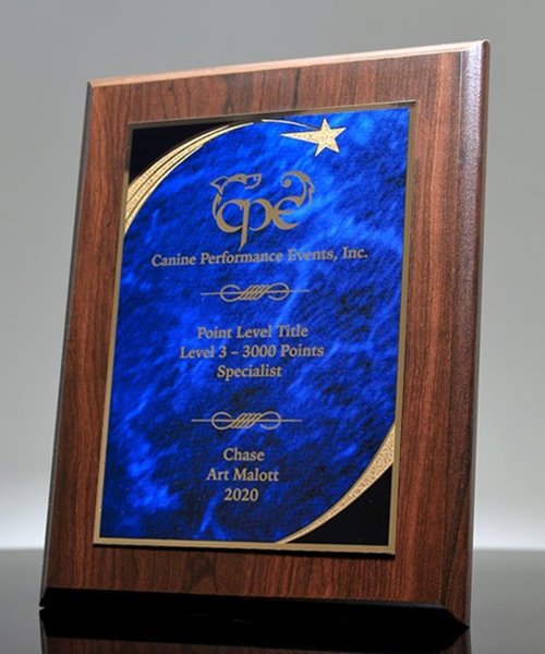 Our Designer Blue Marble Star Plaques are the perfect accolade to use when celebrating special achievements. Choose this plaque as part of your upcoming employee awards celebration. Featuring a walnut finish plaque and a brass-plated star plate with a textured border and marble finish. Your congratulatory message and company logo will be engraved in bright gold. Rush service and shipping available to the entire USA!