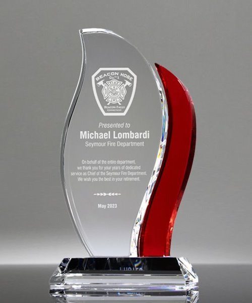 Illuminate the spirit of bravery and courage with our Firefighter Crystal Bravery Flame Trophy, a beacon of recognition for those who confront danger with unwavering resolve. Crafted from premium clear and red optical crystal, this striking award captures the essence of valor amidst the flames. Fully customizable with precision engraving, it serves as a poignant tribute to the fearless individuals who embody the highest ideals of bravery and selflessness in their firefighting duties. Whether honoring individual firefighters or entire departments, this distinguished trophy shines brightly as a symbol of honor and appreciation, forever commemorating their remarkable bravery in the heat of the moment.