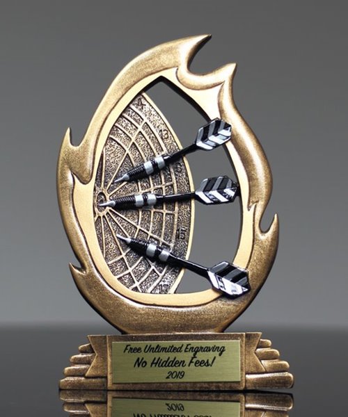 The Flame Series Darts Award is a new design measuring 7.25" with a splash of color. Your personalized congratulatory message will be reproduced in black on a gold plate at the base of the trophy.