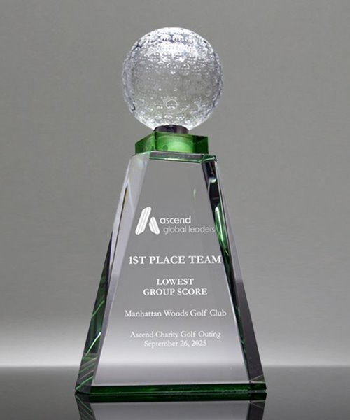 The Golfing Excellence Crystal Trophy is the epitome of golfing achievement. This apex-shaped award is crowned with a spinning golf ball at its peak, symbolizing the pinnacle of skill and dedication. Its elegance is further enhanced by the striking emerald crystal accent that graces the base and cradles the ball. This trophy is not just an accolade; it's a statement of excellence that you can proudly present to your top-performing golfers. It captures the essence of the sport's precision and passion, serving as a lasting tribute to their outstanding accomplishments on the greens.