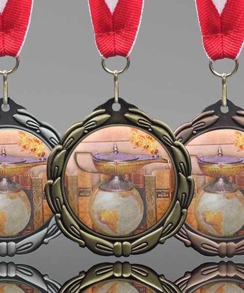 Our Domed Lamp of Knowledge Medals feature a decorative stock mylar designed with brilliant colors and capped off with soft epoxy. All medals are sold with a Free premium Red-White-Blue neck ribbon. Many other neck ribbon colors are pictured below and available for a small surcharge. Additionally, our medals are designed with Free optional engraving on the back.