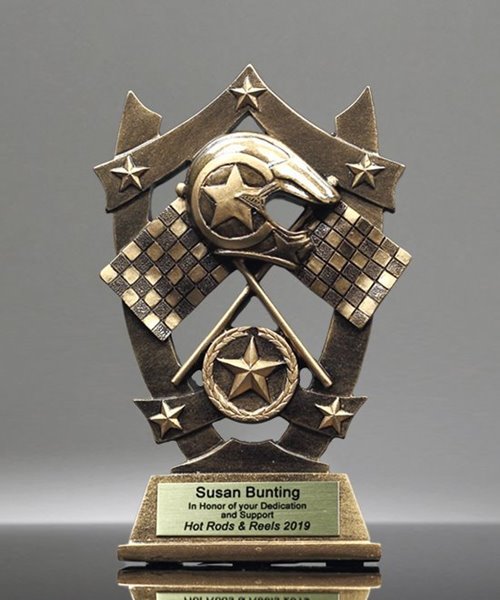 The Star Shield Trophy has nice detail and a contemporary look that features stars surrounding a racing theme. Gold stars highlight the design of this award making it a great choice for recognizing a successful competition. Immediate shipping is available to the entire USA!