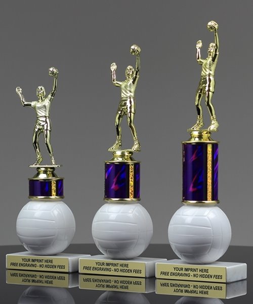 Choose our Volleyball Riser Trophy to recognize your top finishers. Available in three sizes and featuring a unique volleyball and column atop a marble base. Trophies are pictured here with our Purple Splash columns, but many other color choices are available as shown in the photo section. Immediate shipping is available anywhere in the USA!